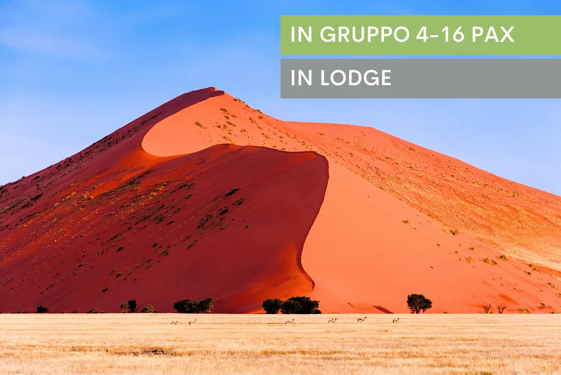Questo itinerario in Namibia prevede sistemazioni in alberghi e lodge, tre e quattro stelle, in camera con servizi privati. La guida e l’autista si occupano del gruppo durante tutto il viaggio, fin dall’accoglienza all’arrivo a Windhoek. Tutte le colazioni sono effettuate negli alberghi, mentre le cene in campeggio. Tutti i pranzi sono a carico del partecipante.Il deserto del Namib con le sue dune più alte del mondo domina l’immaginario del Paese.